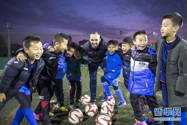 圖為2017年12月8日,在武漢市足球青訓(xùn)營(yíng),西班牙巴塞羅那足球?qū)W校職業(yè)教練塞爾希奧(中)在訓(xùn)練后與小學(xué)員合影。新華社記者肖藝九 攝