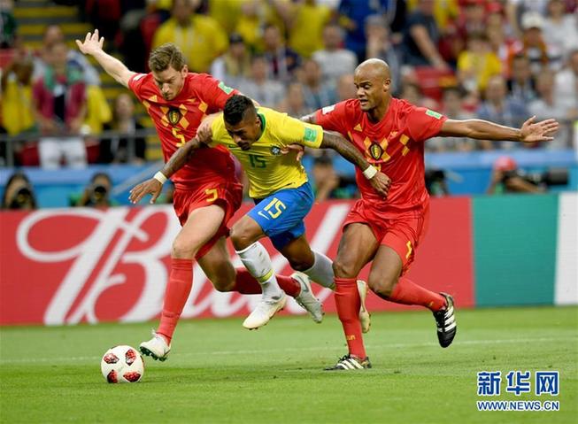 圖為2018年7月6日,在喀山進(jìn)行的2018俄羅斯世界杯足球賽四分之一決賽中,巴西隊(duì)球員保利尼奧(中)與比利時(shí)隊(duì)球員維爾通亨(左)、孔帕尼在比賽中拼搶。巴西隊(duì)以1比2不敵比利時(shí)隊(duì),無(wú)緣四強(qiáng)。新華社記者杜宇 攝