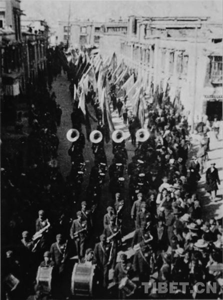 圖片為西藏文工團老照片:十八軍到達拉薩。文工團、軍樂隊參加入城式,行進在八廓街。圖片由王勉之提供