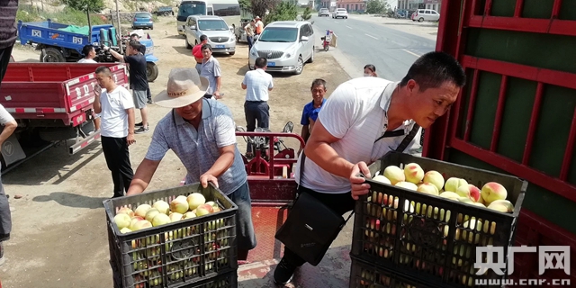 客商正在忙著把蜜桃裝到大貨車上。央廣網記者王晶 攝
