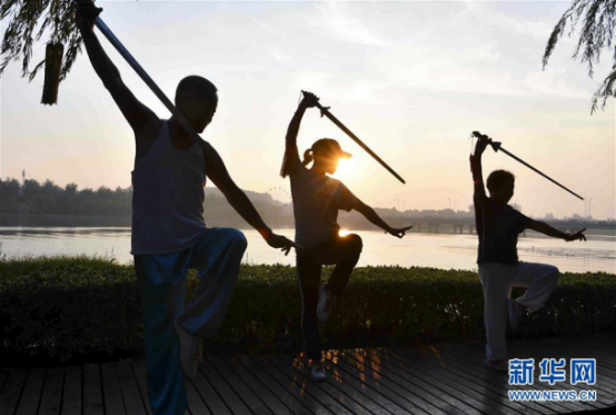 8月3日,亳州市市民在渦河公園晨練健身。盛夏時節(jié),安徽省亳州市不少市民走出家門,通過習練太極拳、太極劍等運動方式,享受晨練健身帶來的樂趣。 新華社發(fā)(劉勤利 攝)