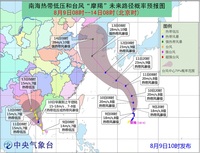 今年第14號(hào)臺(tái)風(fēng)“摩羯”昨天在臺(tái)灣以東洋面生成。預(yù)計(jì)“摩羯”將于11日夜間進(jìn)入東海東部海面,之后在我國(guó)東部海區(qū)北上,強(qiáng)度逐漸加強(qiáng)到強(qiáng)熱帶風(fēng)暴級(jí)(10~11級(jí),25~30米/秒)。12日至14日,東海北部、黃海將先后出現(xiàn)7~9級(jí)大風(fēng),臺(tái)風(fēng)中心經(jīng)過(guò)的海域風(fēng)力有10~11級(jí)、陣風(fēng)12~13級(jí)。