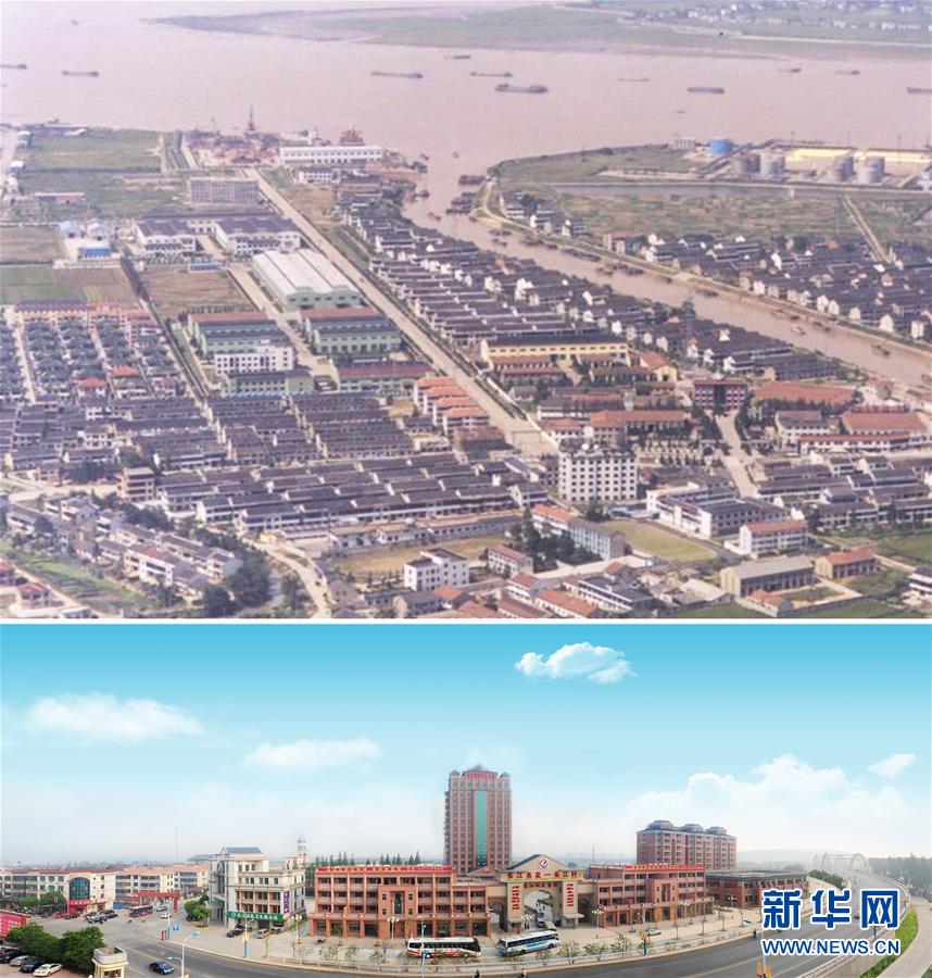 下游張家港市長江村。拼版照片:上圖為20世紀80年代拍攝的江蘇蘇州張家港市長江村;下圖為江蘇蘇州張家港市長江村新貌。新華社發(fā)(資料照片)