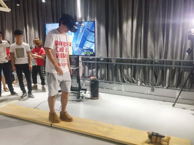 在山路騎行體驗區(qū),體驗者需佩戴VR眼鏡騎車,屏幕上的山路場景會隨移動轉換,時而上坡、時而急轉彎、時而平緩……車身也會隨場景左右擺動。在高空涉險體驗區(qū),參與者小心翼翼的在平地上移動著腳步,原來在vr的世界里面,體驗者正站在高樓外狹窄的木板上試圖“營救”蜷縮在木板盡頭的“虛擬”小貓。