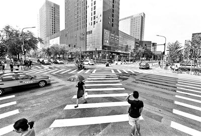 8月17日,石景山區的魯谷西街與政達路交叉處的十字路口有了新樣貌。與傳統的十字路口不同,除了四條常規的人行道之外,路口處多出了兩條交叉對角線作為人行斑馬線。