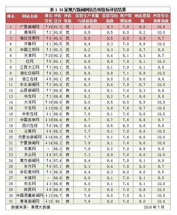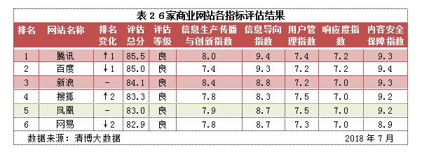網站信息生態指數2018年7月榜:地方新聞網站、主要商業網站生態建設良好