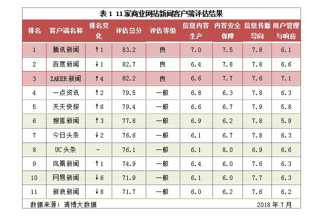 新聞客戶端信息生態指數2018年7月榜:商業網站新聞客戶端總體生態一般