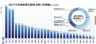 昨日(24日)上午,交通運(yùn)輸部召開(kāi)例行發(fā)布會(huì),發(fā)布了《2017年全國(guó)收費(fèi)公路統(tǒng)計(jì)公報(bào)》(以下簡(jiǎn)稱(chēng)《公報(bào)》),截至2017年底,全國(guó)收費(fèi)公路債務(wù)余額52843.5億元,通行費(fèi)收支缺口達(dá)4026.5億元,收費(fèi)公路超八成的收入用于償還債務(wù)本金及利息。