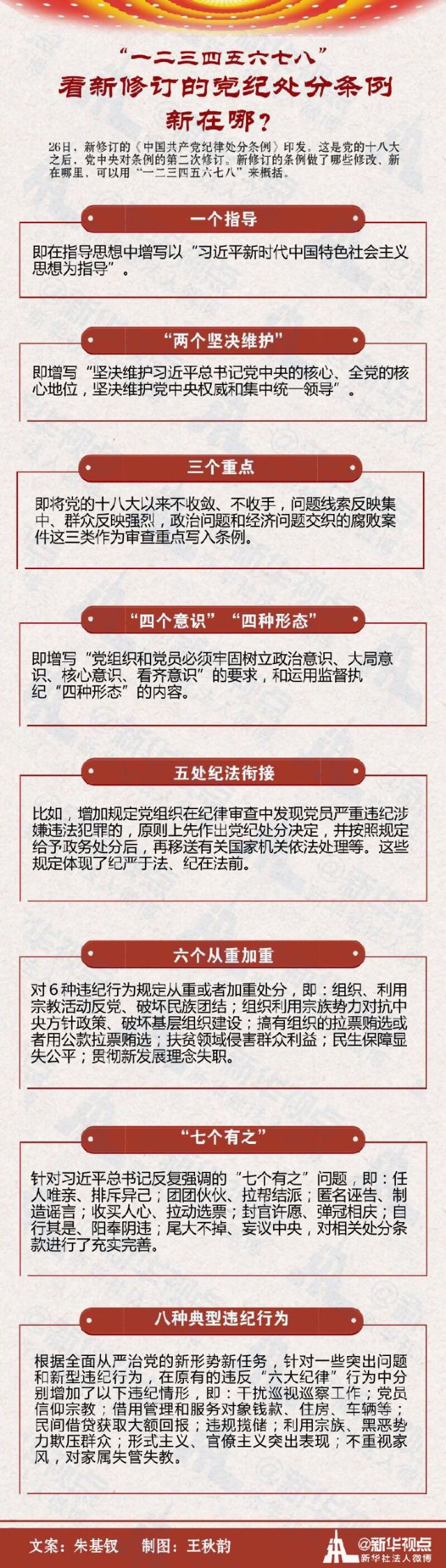 新版黨紀處分條例將于2018年10月1日起施行。它的頒布施行必將不斷提高紀律建設的政治性、時代性、針對性,以更加科學、更加嚴密、更加有效的思路舉措,推動全面從嚴治黨取得更大戰略性成果。