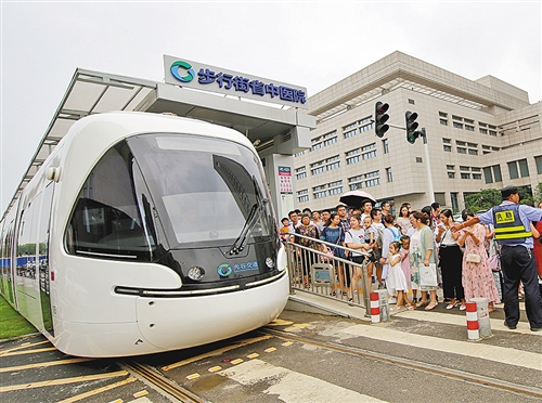 湖北省武漢市省中醫(yī)院門口,乘客在等待有軌電車。近年來,當?shù)匕训罔F、有軌電車、公交車和出租車站點安排在離醫(yī)院近的地方,讓百姓方便就醫(yī)。鄭傳海 攝