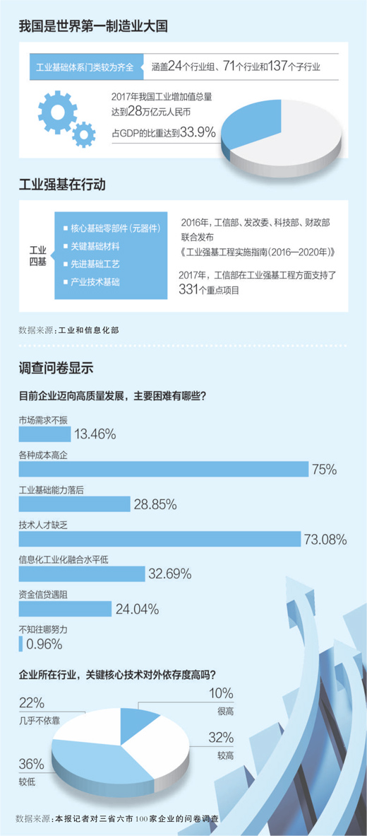 “要實(shí)現(xiàn)從‘有’到‘好’的轉(zhuǎn)變,在高端產(chǎn)品上突破,還需要時(shí)間。”調(diào)查中企業(yè)坦言,我國部分核心技術(shù)、關(guān)鍵產(chǎn)品和重大裝備仍存瓶頸制約,一些工業(yè)產(chǎn)品在一致性、穩(wěn)定性和使用壽命方面與國外先進(jìn)水平差距較大,工業(yè)基礎(chǔ)須進(jìn)一步夯實(shí)。