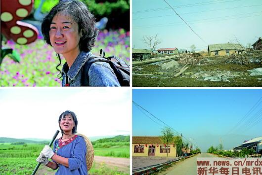 ▲左上圖為冷菊貞來小南河之前,是位漂亮的時尚女;左下圖為冷菊貞來小南河后干農(nóng)活,臉龐變得黝黑,成為一個“農(nóng)婦”(本報記者何山攝)。右上圖和右下圖為冷菊貞來小南河村前后村貌對比圖。(冷菊貞攝)