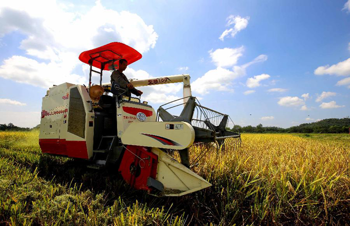 8月22日,江西省靖安縣仁首鎮石下村農民駕駛農機收割中稻。新華社發(徐仲庭 攝)