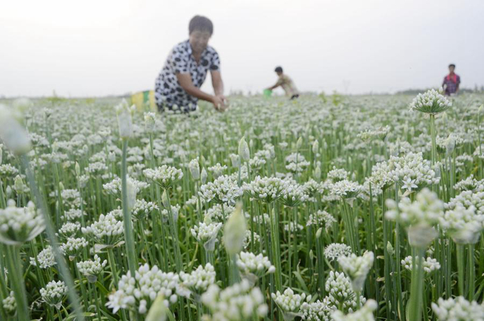 8月28日,在濱城區三河湖鎮大營劉村樂旋自然蔬菜專業合作社韭菜基地,村民尹美英在采摘韭花。 新華社發(李榮新 攝)