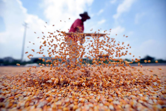 8月30日,山東省臨沂市郯城縣馬頭鎮農民在晾曬玉米。新華社發(房德華 攝)