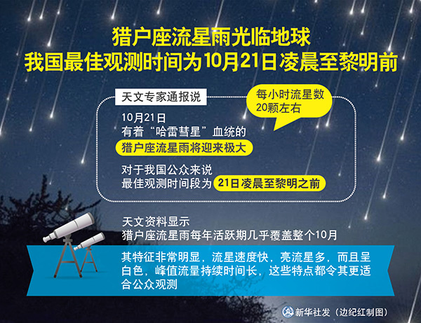 圖表:獵戶座流星雨光臨地球 我國最佳觀測時(shí)間為10月21日凌晨至黎明前 新華社發(fā) 邊紀(jì)紅 制圖