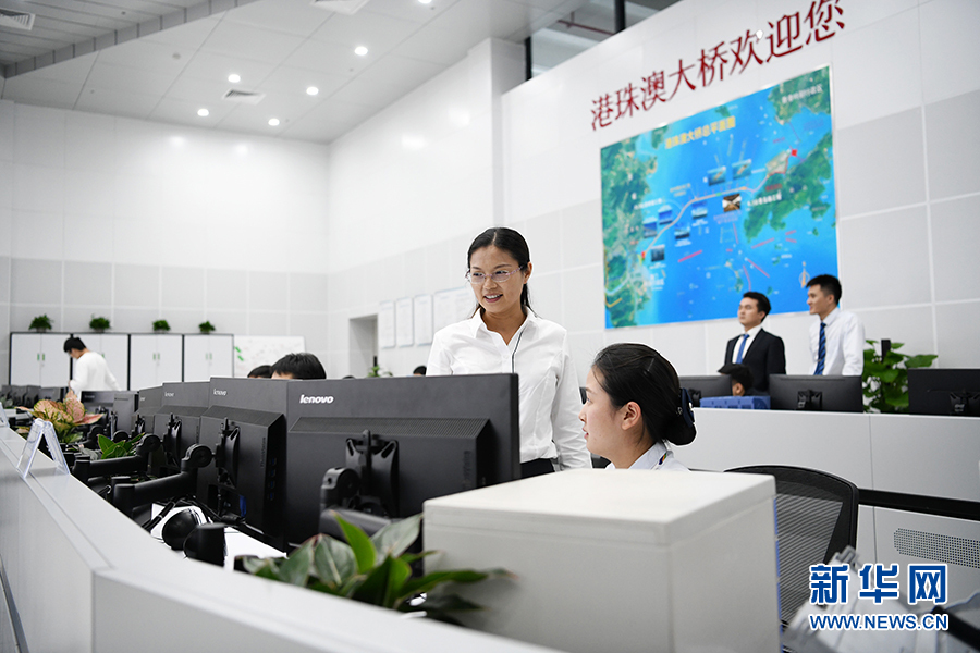 港珠澳大橋管理局營運管理部部長江曉霞(中間站立者)在調度中心查看大橋車輛通行情況(10月24日攝)。新華社記者梁旭攝