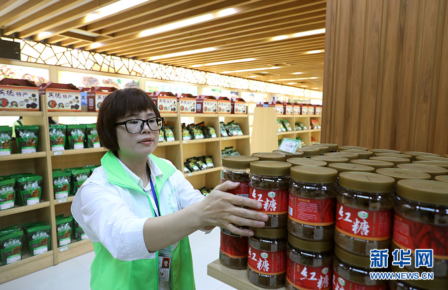 在英德市電子商務產業園,農特產品o2o體驗館的工作人員將本地電商企業生產的紅糖商品上架展銷(10月24日攝)。新華社記者王瑞平攝