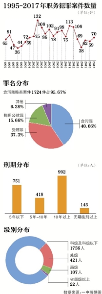 昨天上午,北京一中院發布《1995年-2018年職務犯罪白皮書》(以下簡稱白皮書)。作為承擔了北京近四成的職務犯罪審判任務的法院,23年來,一中院通過審理的1800余件職務犯罪案件,總結出了該類案件的主要特征和發展趨勢。近年來,職務犯罪中“小官”犯罪占比較高、犯罪行為時間跨度平均為7年,“初犯”低齡化職務犯罪特征初顯等。