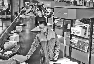 11月11日,工作人員在江蘇省南通市一家快遞公司分揀系統(tǒng)旁忙碌。國家郵政局預計,今年“雙11”期間,全行業(yè)處理的郵件、快件業(yè)務量有望超過18.7億件,最高日處理量是平日的3倍。新華社發(fā)(許叢軍攝)