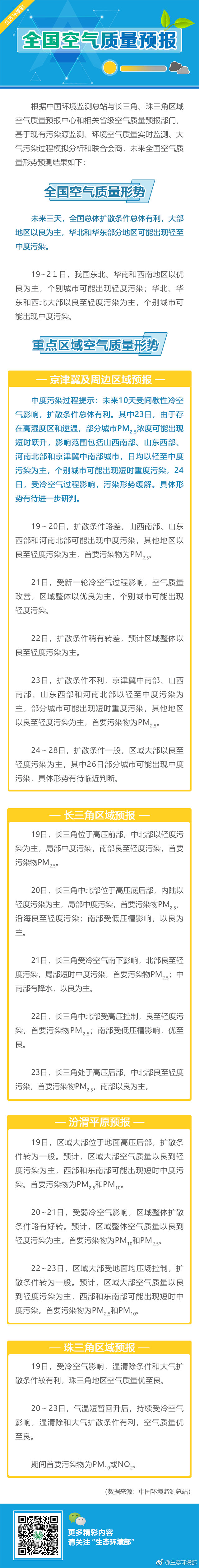 據(jù)生態(tài)環(huán)境部官方微博消息,未來(lái)三天(11月19-21日),全國(guó)總體擴(kuò)散條件總體有利,大部地區(qū)以良為主,華北和華東部分地區(qū)可能出現(xiàn)輕至中度污染。