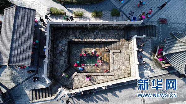 人們在江西宜春溫湯鎮(zhèn)的溫泉泉眼邊打水(2月28日無人機(jī)拍攝)。? 新華社記者 彭昭之 攝