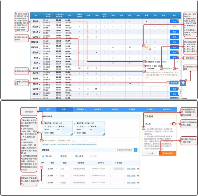 每位用戶可提交1個(gè)候補(bǔ)訂單,1個(gè)訂單中可添加發(fā)到站相同(可以是同城的不同車站)的2個(gè)相鄰的乘車日期, 每個(gè)乘車日期可添加2個(gè)不同“車次+席別”的組合需求。