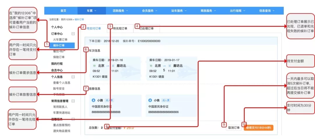手機APP示意圖 候補訂單提交成功后需在30分鐘內完成支付,完成候補預付款支付后,候補購票訂單立即生效。候補購票訂單生效后,相關候補需求不可修改,如需變更,可終止訂單后重新操作。兌現時,按照候補訂單生效的時間順序,兌現符合條件的候補需求。預付款按該單不同組合需求中票款的最高額度計算(臥鋪按下鋪票價計算)。 候補購票預付款支付成功后,系統(tǒng)將持續(xù)嘗試為您兌現候補需求(同一候補需求不進行部分兌現),若有匹配需求的車票,系統(tǒng)將自動為您生成已支付訂單,預付款大于實際票款的,系統(tǒng)將自動退回差額票款;若無匹配需求的車票,系統(tǒng)將在截止兌現時間自動終止兌現,用戶主動終止或系統(tǒng)自動終止候補的,系統(tǒng)自動全額退還預付款。 兌現成功或自動終止時,將通過您選擇的通知方式進行告知,請注意查收消息并關注“候補訂單”兌現狀態(tài)。兌現成功車票視為已購車票,退改簽按既有規(guī)則辦理。 劃重點 候補訂單提交成功后 需要在30分鐘內完成支付 預付款按組合需求中票款最高額度計算 系統(tǒng)自動退回差額票款 登錄12306.cn網站,在個人中心導航欄上點擊“候補訂單”可進入訂單查看頁,候補訂單分為“待支付訂單”、“待兌現訂單”和“已處理訂單”三個選項,其中“已處理訂單”包含已兌現、已退單和兌現失敗三種狀態(tài)訂單,已兌現表示候補需求兌現成功;已退單表示用戶主動退單;兌現失敗表示候補需求兌現失敗,可能為車票數量不足、與實名制規(guī)定沖突等原因。