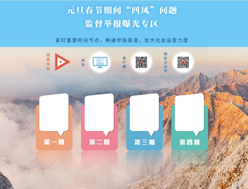 2019年元旦、春節(jié)將至,為切實(shí)抓好節(jié)日期間落實(shí)中央八項(xiàng)規(guī)定及其實(shí)施細(xì)則精神、糾正“四風(fēng)”工作,營(yíng)造風(fēng)清氣正節(jié)日氛圍,中央紀(jì)委國(guó)家監(jiān)委網(wǎng)站推出“元旦春節(jié)期間‘四風(fēng)’問(wèn)題監(jiān)督舉報(bào)曝光專區(qū)”,暢通監(jiān)督舉報(bào)渠道,加大典型案例通報(bào)曝光力度,增強(qiáng)警示震懾和教育引導(dǎo)作用。