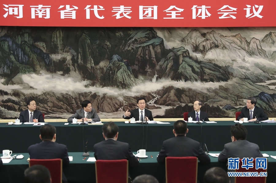 韓正參加了河南代表團審議。在聽取謝伏瞻、陳潤兒、裴春亮等代表發言后,韓正說,要深刻認識中國特色社會主義進入新時代的歷史過程、時代背景、偉大變革和豐富內涵,把握我國發展新的歷史方位,增強“四個意識”,堅定“四個自信”,始終同以習近平同志為核心的黨中央保持高度一致。韓正對河南工作給予充分肯定,希望河南深入學習貫徹習近平新時代中國特色社會主義思想和黨的十九大精神,把握我國發展重要戰略機遇期內涵和條件變化,牢記習近平總書記“讓中原更加出彩”的殷切期望,打好產業結構優化升級、創新驅動發展、基礎能力建設、新型城鎮化“四張牌”,加強和改善黨的領導,弘揚焦裕祿精神、紅旗渠精神、愚公移山精神,努力開創河南工作新局面。