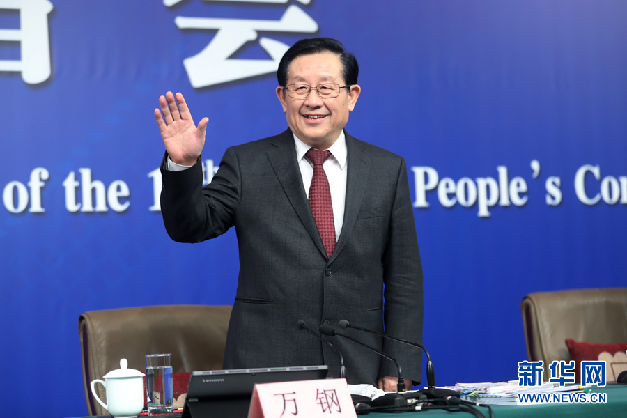 十三屆全國人大一次會議新聞中心于10日上午10時(shí)45分在梅地亞中心多功能廳舉行記者會,邀請科技部部長萬鋼、政策法規(guī)與監(jiān)督司司長賀德方、創(chuàng)新發(fā)展司司長許倞就“加快建設(shè)創(chuàng)新型國家”相關(guān)問題回答中外記者提問。圖為萬鋼向記者示意。新華網(wǎng)/中國政府網(wǎng) 翟子赫 攝