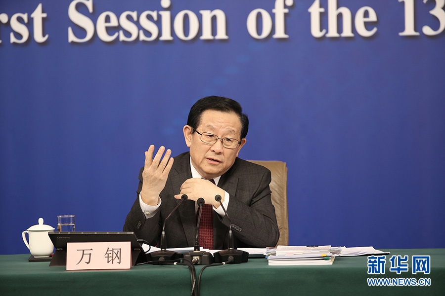 十三屆全國人大一次會議新聞中心于10日上午10時45分在梅地亞中心多功能廳舉行記者會,邀請科技部部長萬鋼、政策法規與監督司司長賀德方、創新發展司司長許倞就“加快建設創新型國家”相關問題回答中外記者提問。圖為萬鋼回答記者提問。新華網/中國政府網 翟子赫 攝