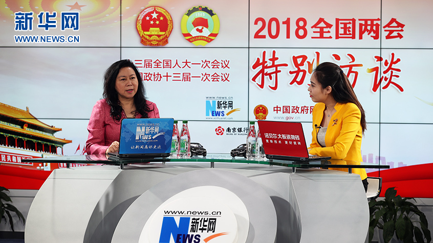 圖為全國政協委員、新大陸科技集團總裁王晶做客新華網2018全國兩會特別訪談。新華網 郭小天攝