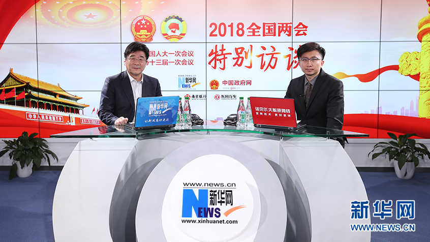 3月11日,全國政協委員、中國人民大學校長劉偉(左)做客新華網2018全國兩會特別訪談。新華網?郭小天攝