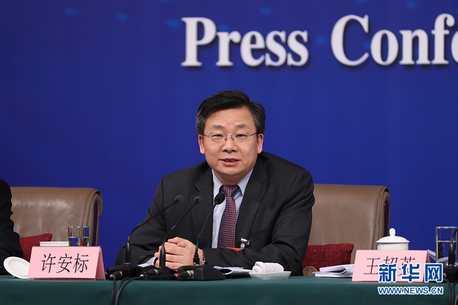 3月12日,十三屆全國人大一次會議新聞中心在梅地亞中心多功能廳舉行記者會,邀請十二屆全國人大內司委副主任委員王勝明、財經委副主任委員烏日圖、教科文衛委副主任委員吳恒、環資委委員呂彩霞,全國人大常委會法工委副主任王超英、副主任許安標就“人大立法工作”相關問題回答中外記者提問。圖為全國人大常委會法工委副主任許安標回答記者提問。新華網/中國政府網 翟子赫 攝