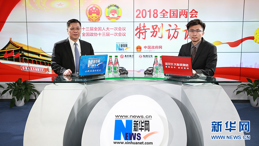 3月12日,全國人大代表、浙江華海藥業(yè)股份有限公司董事長陳保華(左)做客新華網(wǎng)2018全國兩會特別訪談。新華網(wǎng) 楊锘攝
