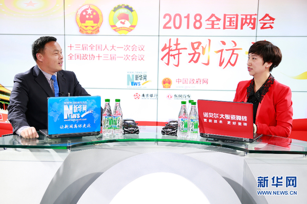 圖為全國人大代表、河南省平頂山市寶豐縣大黃村黨支部書記馬豹子做客新華網2018全國兩會特別訪談 新華網 范作言 攝