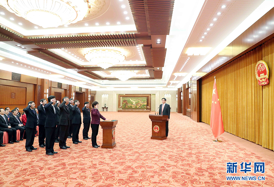 剛剛閉幕的十三屆全國人大常委會第一次會議任命了全國人大常委會副秘書長、預算工作委員會主任、第四任香港特別行政區基本法委員會主任和第四任澳門特別行政區基本法委員會主任。根據全國人大常委會關于實行憲法宣誓制度的決定,上述人員依法進行憲法宣誓。