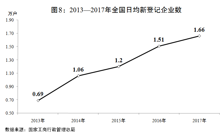 二是大眾創(chuàng)業(yè)萬眾創(chuàng)新不斷深化。《國務(wù)院關(guān)于強(qiáng)化實(shí)施創(chuàng)新驅(qū)動發(fā)展戰(zhàn)略進(jìn)一步推進(jìn)大眾創(chuàng)業(yè)萬眾創(chuàng)新深入發(fā)展的意見》(國發(fā)〔2017〕37號)印發(fā)實(shí)施。新支持92個(gè)國家雙創(chuàng)示范基地建設(shè),建成4298家眾創(chuàng)空間、3255家科技企業(yè)孵化器和400余家企業(yè)加速器,第三屆全國雙創(chuàng)活動周及“創(chuàng)響中國”巡回接力活動成功舉辦。全年新登記企業(yè)達(dá)到607.4萬戶,增長9.9%,日均新登記企業(yè)達(dá)到1.66萬戶。