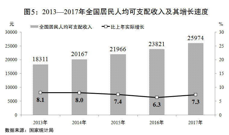 全國居民人均可支配收入達(dá)到25974元,實(shí)際增長7.3%,高于國內(nèi)生產(chǎn)總值增速0.4個(gè)百分點(diǎn),農(nóng)村居民收入增長繼續(xù)快于城鎮(zhèn)居民。