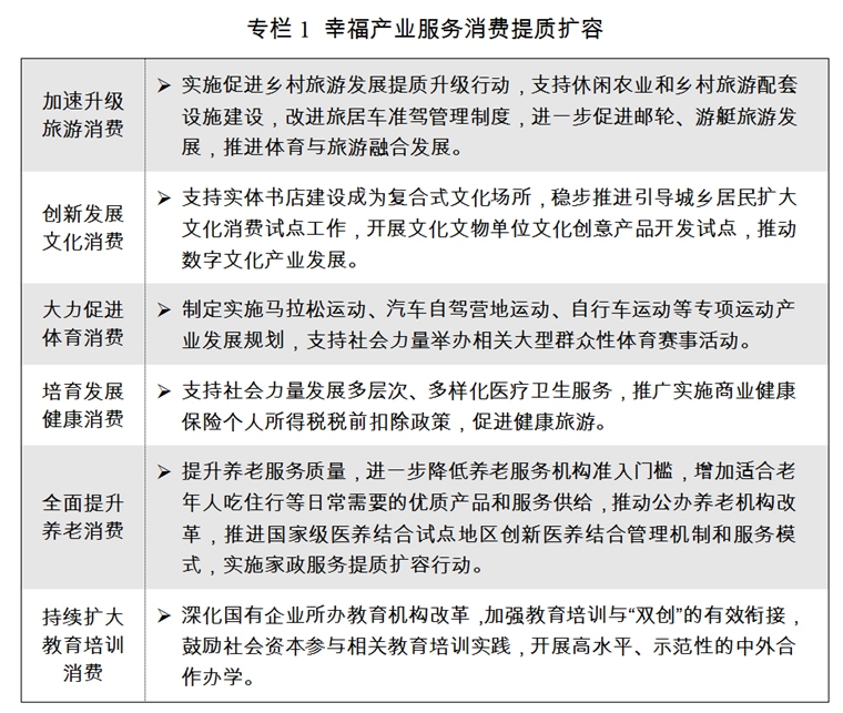 一是完善促進(jìn)消費(fèi)的體制機(jī)制。繼續(xù)推進(jìn)實(shí)施“十大擴(kuò)消費(fèi)行動”,支持社會力量進(jìn)入醫(yī)療、養(yǎng)老、教育、文化、體育等領(lǐng)域,推動互聯(lián)網(wǎng)與養(yǎng)老、醫(yī)療、家政、快遞等服務(wù)業(yè)融合發(fā)展。大力支持健康產(chǎn)業(yè)發(fā)展,建設(shè)優(yōu)質(zhì)養(yǎng)老服務(wù)供給體系。推進(jìn)家政服務(wù)提質(zhì)擴(kuò)容,推動家政服務(wù)從業(yè)人員職業(yè)化建設(shè)。