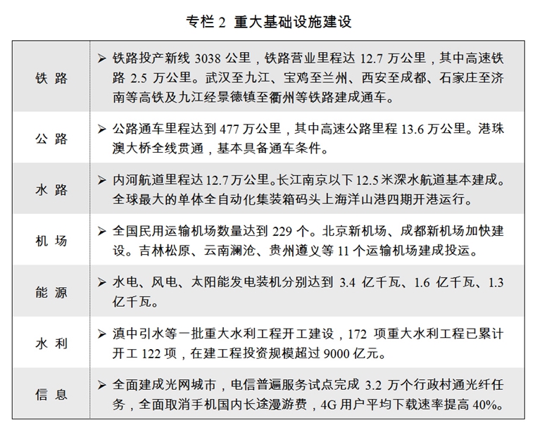四是加強(qiáng)水利交通能源等基礎(chǔ)設(shè)施建設(shè)。今年要完成鐵路投資7320億元、公路水運(yùn)投資1.8萬億元左右,水利在建投資規(guī)模達(dá)到1萬億元。再開工一批重大水利工程,加強(qiáng)中小河流治理、小型病險(xiǎn)水庫除險(xiǎn)加固等水利薄弱環(huán)節(jié)建設(shè)。加快建設(shè)北京至沈陽、商丘經(jīng)合肥至杭州、鄭州至萬州高鐵,開工建設(shè)北京至雄安、和田至若羌等鐵路。有序發(fā)展高速公路,支持普通國省干線提級改造。進(jìn)一步完善通江達(dá)海、干支銜接的航道網(wǎng)絡(luò),提高干線航道通航能力和支線航道等級。積極推進(jìn)北京、成都、青島等新機(jī)場建設(shè),推進(jìn)一批樞紐機(jī)場改擴(kuò)建和支線機(jī)場項(xiàng)目建設(shè)。支持符合條件的城市有序發(fā)展城市軌道交通。推動“互聯(lián)網(wǎng)+”便捷交通建設(shè),提升綜合交通服務(wù)質(zhì)量。加快構(gòu)建便捷高效、綠色安全骨干物流基礎(chǔ)設(shè)施網(wǎng)絡(luò)。落實(shí)能源生產(chǎn)和消費(fèi)革命戰(zhàn)略,推進(jìn)能源革命試點(diǎn)示范,開展非化石能源跨越發(fā)展行動,構(gòu)建清潔能源消納長效機(jī)制,加快傳統(tǒng)能源清潔高效利用,加強(qiáng)電網(wǎng)、油氣管網(wǎng)布局優(yōu)化和互聯(lián)互通,增強(qiáng)天然氣供給保障能力和油氣儲備應(yīng)急能力。