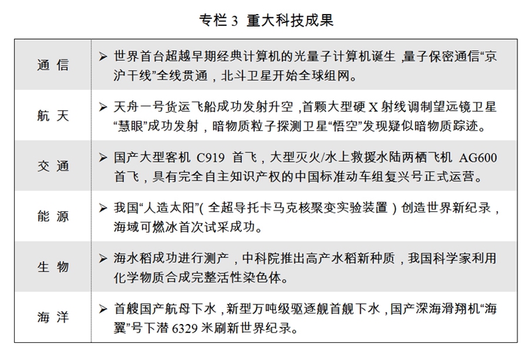一批重大科技成果涌現(xiàn),“慧眼”衛(wèi)星成功發(fā)射運(yùn)行,C919大型客機(jī)首飛,量子計(jì)算機(jī)研制取得重大突破,首艘國產(chǎn)航母順利下水,海域可燃冰首次試采成功。全面創(chuàng)新改革試驗(yàn)深入推進(jìn),169項(xiàng)先行先試改革舉措全面啟動,其中13項(xiàng)改革舉措向全國推廣。北京、上海科技創(chuàng)新中心,北京懷柔、上海張江、安徽合肥三個(gè)綜合性國家科學(xué)中心加快建設(shè)。國家實(shí)驗(yàn)室建設(shè)啟動,國家重大科技基礎(chǔ)設(shè)施建設(shè)持續(xù)推進(jìn)。國家科技重大專項(xiàng)加速攻堅(jiān),“科技創(chuàng)新2030-重大項(xiàng)目”啟動實(shí)施。研發(fā)費(fèi)用加計(jì)扣除、股權(quán)激勵(lì)和技術(shù)入股所得稅優(yōu)惠政策、完善高新技術(shù)企業(yè)認(rèn)定辦法等進(jìn)一步落實(shí),17家國家自主創(chuàng)新示范區(qū)、156家國家高新區(qū)形成區(qū)域創(chuàng)新發(fā)展的核心載體和重要引擎。