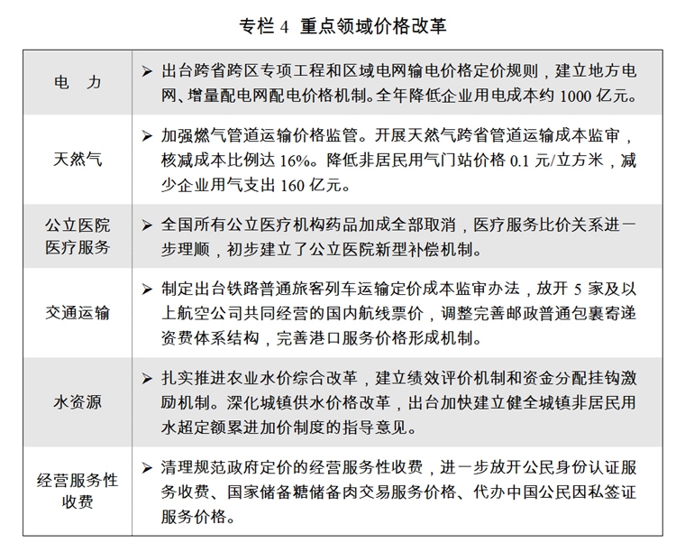 五是價(jià)格改革繼續(xù)深化。全面深化價(jià)格機(jī)制改革的意見出臺實(shí)施。持續(xù)推進(jìn)能源領(lǐng)域價(jià)格改革,完成首輪省級電網(wǎng)輸配電價(jià)改革,降低非居民用氣基準(zhǔn)門站價(jià)格,天然氣全產(chǎn)業(yè)鏈價(jià)格監(jiān)管制度基本建立。公立醫(yī)院藥品加成全部取消,公立醫(yī)療機(jī)構(gòu)特需等醫(yī)療服務(wù)定價(jià)穩(wěn)步放開。交通運(yùn)輸價(jià)格改革加快推進(jìn)。水資源價(jià)格改革穩(wěn)步推進(jìn)。