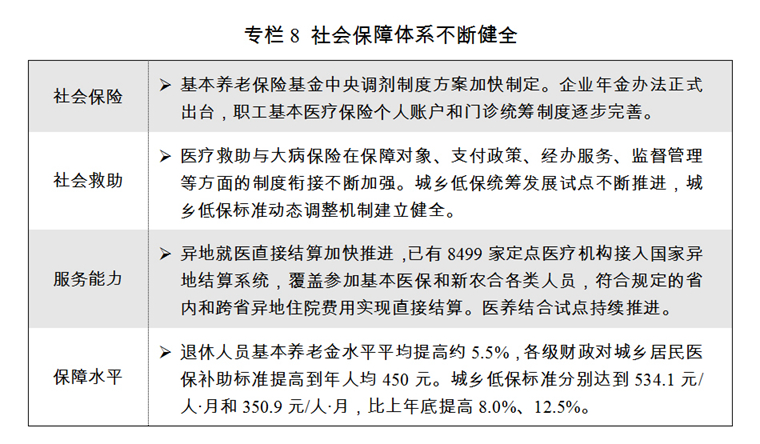 二是社會保障體系不斷健全。養(yǎng)老保險(xiǎn)制度頂層設(shè)計(jì)取得關(guān)鍵性進(jìn)展,劃轉(zhuǎn)部分國有資本充實(shí)社保基金實(shí)施方案印發(fā)實(shí)施。城鄉(xiāng)居民基本醫(yī)療保險(xiǎn)制度整合深入推進(jìn),異地就醫(yī)直接結(jié)算取得重要突破,所有省級異地就醫(yī)結(jié)算系統(tǒng)、所有統(tǒng)籌地區(qū)均與國家異地就醫(yī)結(jié)算系統(tǒng)實(shí)現(xiàn)對接。高齡津貼制度已在全國31個(gè)省份和新疆生產(chǎn)建設(shè)兵團(tuán)實(shí)現(xiàn)全覆蓋。城鎮(zhèn)職工基本養(yǎng)老和城鄉(xiāng)居民養(yǎng)老保險(xiǎn)參保人數(shù)分別達(dá)到4.02億人和5.13億人。城鎮(zhèn)棚戶區(qū)住房改造開工609萬套。