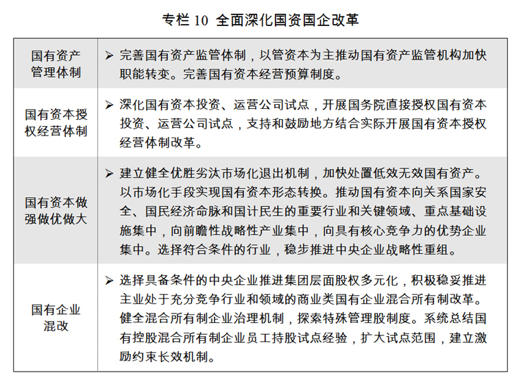 五是深化國資國企改革。完善各類國有資產(chǎn)管理體制,以管資本為主加快轉(zhuǎn)變國有資產(chǎn)監(jiān)管機(jī)構(gòu)職能,改革國有資本授權(quán)經(jīng)營體制。加快國有經(jīng)濟(jì)布局優(yōu)化、結(jié)構(gòu)調(diào)整、戰(zhàn)略性重組,以資本為紐帶促進(jìn)各類所有制企業(yè)優(yōu)勢互補(bǔ),推動國有資本做強(qiáng)做優(yōu)做大。積極穩(wěn)妥推進(jìn)國有企業(yè)股權(quán)多元化和混合所有制改革,進(jìn)一步推動重點(diǎn)領(lǐng)域混合所有制改革試點(diǎn),培育具有全球競爭力的世界一流企業(yè)。深化國有林區(qū)林場、農(nóng)墾改革。