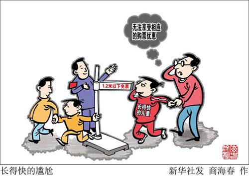 無論是聯(lián)合國兒童權(quán)利公約,還是我國相關(guān)法律法規(guī),界定兒童的唯一標(biāo)準(zhǔn)就是年齡。他們與成年人最大的區(qū)別,是履行社會(huì)責(zé)任能力的不足,與高矮胖瘦無關(guān)。兒童票優(yōu)惠政策是國家和社會(huì)對(duì)這一特殊群體的關(guān)懷,在個(gè)體生理狀況存在差異的情況下,年齡是最科學(xué)也最公平的標(biāo)準(zhǔn)。若依某項(xiàng)生理指標(biāo)制定優(yōu)惠標(biāo)準(zhǔn),不但有失公允,而且有歧視之嫌。