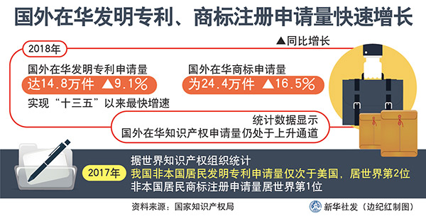 新華社北京1月11日電(記者張泉)記者10日從國家知識產權局獲悉,2018年,國外在華發明專利申請量、商標注冊申請量快速增長,國際社會對中國知識產權保護的信心持續增強。