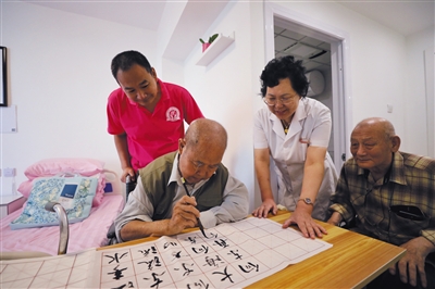 去年9月12日,安貞街道安華怡園養老照料中心開門迎客,入住老人在房間里練習書法。資料圖片/記者 王飛 攝