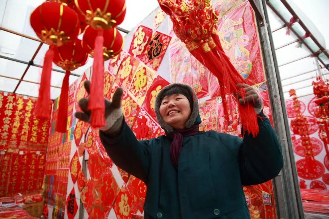 2019-01-27,遼寧省東港市。春節前夕,一位阿姨在對聯市場挑選燈籠。作者:青春